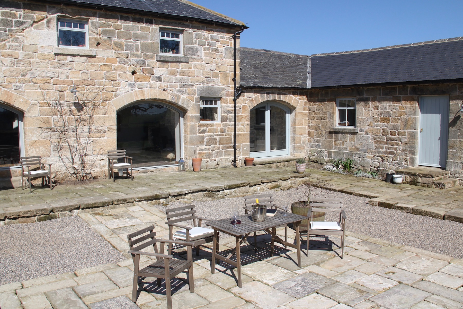 We moved in to the renovated Cragend Grange in August 2014, having dismantled the middle Dairy barn to create a central space, and work started on the internal courtyard in the south. The Armstrong Wing bedroom suite was also completed during 2015. We had to point the stonework and then start to lay the terrace with very heavy paving stones that were originally here in the barns. Shaun laid all the top terrace without machinery, resorting to a cantilevered winch to move the heavy stones for the east path. Finally, we had to build two walls, and move several tons of stone that were left over from the barn that had been taken down.