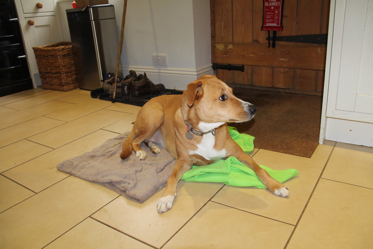 She is the most placid, polite and delightful dog and enjoyed four seasons in one week at Cragend Farm in March.