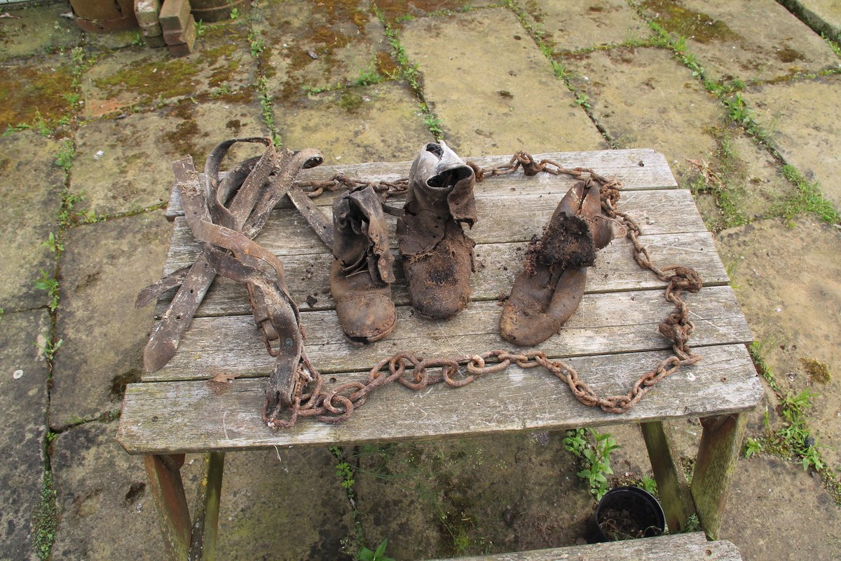 Over the years it had been stuffed with barbed wire and metal, we thought, as a way to stop the animals (sheep, cows) getting to close to this window, but once we started to clear the larger debris, we found buried in the mud beneath all this rubbish, several; old boots and some metal tools. The large chain and leather straps are interesting as we piece together what belongs to the Silo and what is other farm ephemera.
