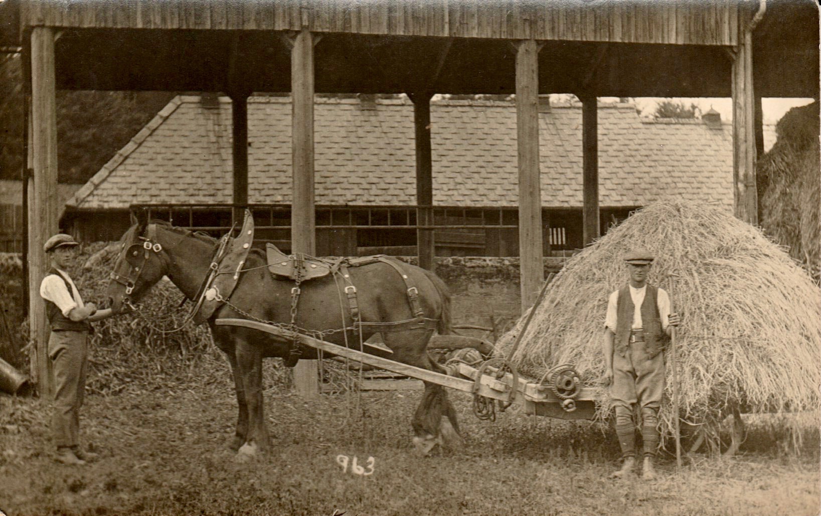 This photograph is of James and George Thompson who lived at Cragend Farm. Their parents were tenants of Lord Armstrong of Cragside. It was taken in 1921. The hay cart would have been driven onto the weighbridge to be weighed, and then the hay stored wither in the Dutch Barn or inside in the main barn. We have many horseshoes left over from this period when the heavy horses did all the hard work. They are brothers. Sadly, George was killed in World War II but James (Jimmy) lived here until his death (2007?)